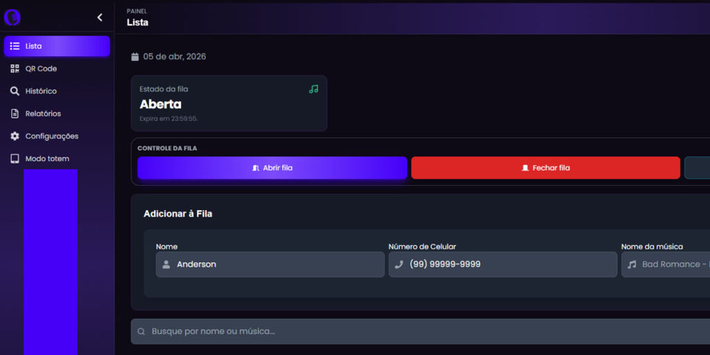 - O sistema carregará automaticamente a interface otimizada para o público, exibindo a fila atual e o campo de busca de músicas.