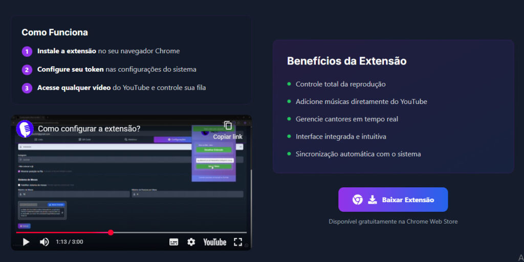 Um dos gargalos mais comuns do karaokê é o tempo entre músicas. O Palco na Mão conta com uma extensão que permite rodar vídeos automaticamente no YouTube, reduzindo pausas longas, falhas humanas e momentos de silêncio que quebram o clima do bar.
